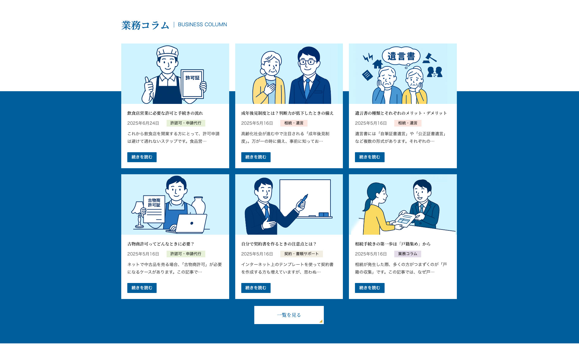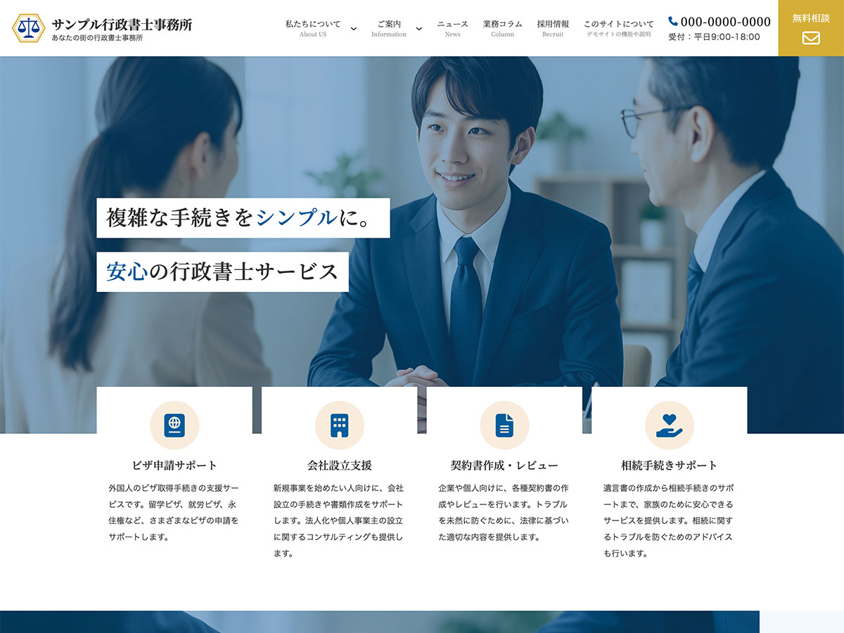 もちろん、レスポンシブでスマホ、タブレットでの閲覧にも最適化されており、これから行政書士業務を本格的にスタートされる方にも、既存サイトのリニューアルを検討中の方にもおすすめです。